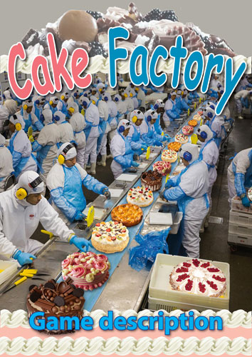 The cake factory is running at full speed. The cake bakers move their freshly baked cakes over the conveyor belts and the rotating cake platforms to the central hall. There, a cherry is placed on their cake to complete it. The cakes then head to the factory exit where they end up in the cake boxes in preparation for shipment to all parts of the country.