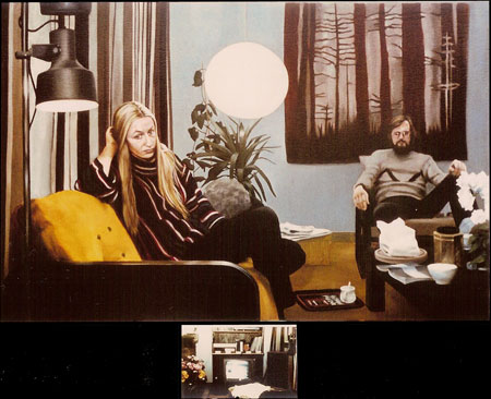 Zes schilderijen van huiskamers waar de bewoners televisie kijken. Onder (of naast) het schilderij hangt een foto van het televisietoestel, waarnaar ze kijken. Olieverf op linnen (120 x 80 cm), formaat foto (24 x 18 cm).