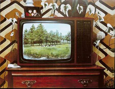 Six paintings of television sets with a TV broadcast about the Dutch landscape. Oil painting on canvas (100 x 80 cm).