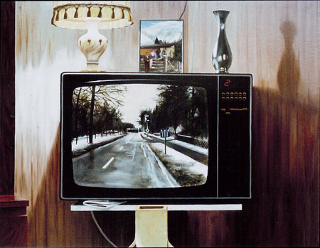Six paintings of television sets with a TV broadcast about the Dutch landscape. Oil painting on canvas (100 x 80 cm).